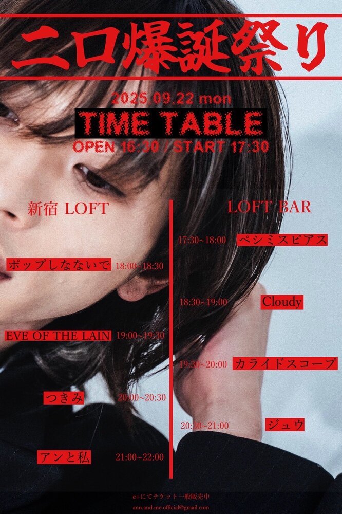 2025年9⽉22⽇ (⽉) ⼆⼝爆誕祭り 新宿LOFT & LOFT BAR 開場 16:30/開演 17:30 ADV:¥3,900 出演者はフライヤーを見てね [3次プレオーダー先⾏] 受付期間 2025年8⽉4⽇(⽉) 22:00 〜 2025年8⽉17⽇(⽇) 23:59 https://eplus.jp/ann-and-me/