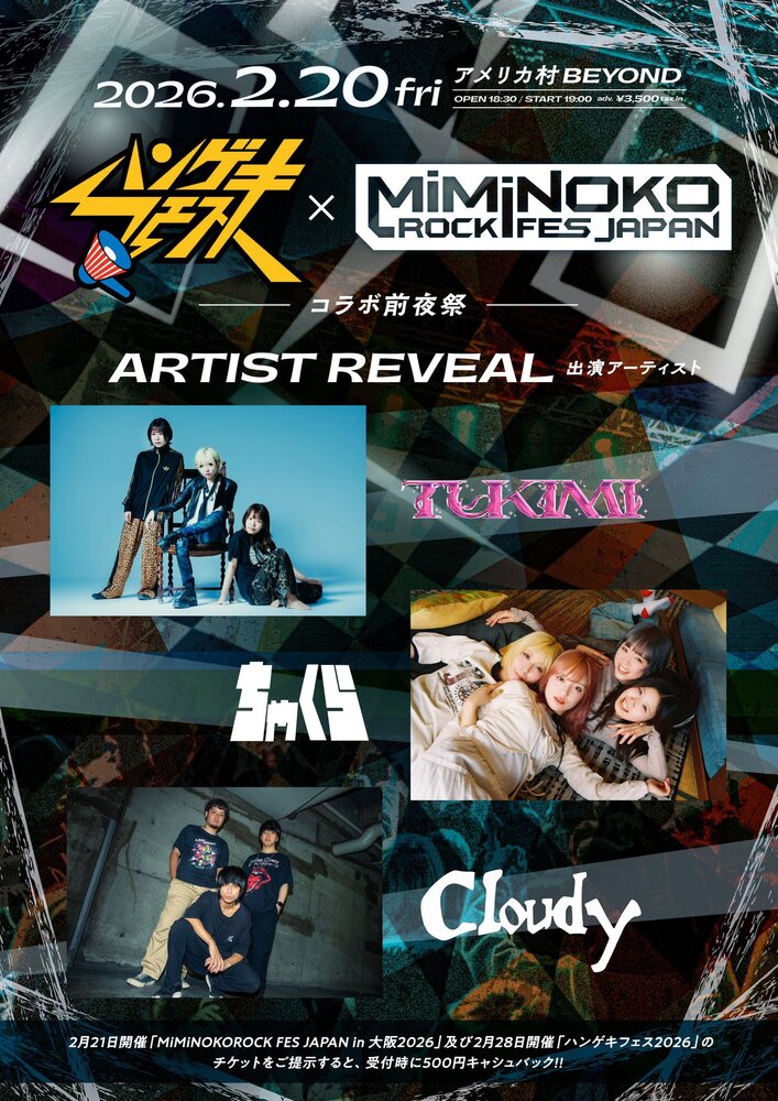 ハンゲキフェス× MiMiNOKOROCK FES JAPANコラボ前夜祭 SCHEDULE 2026/02/20(金) 大阪 心斎橋 アメリカ村BEYOND 2/20 アメリカ村BEYOND ハンゲキフェス× MiMiNOKOROCK FES JAPANコラボ前夜祭 https://livepocket.jp/e/hangeki-miminoko URLをコピーする 報告する