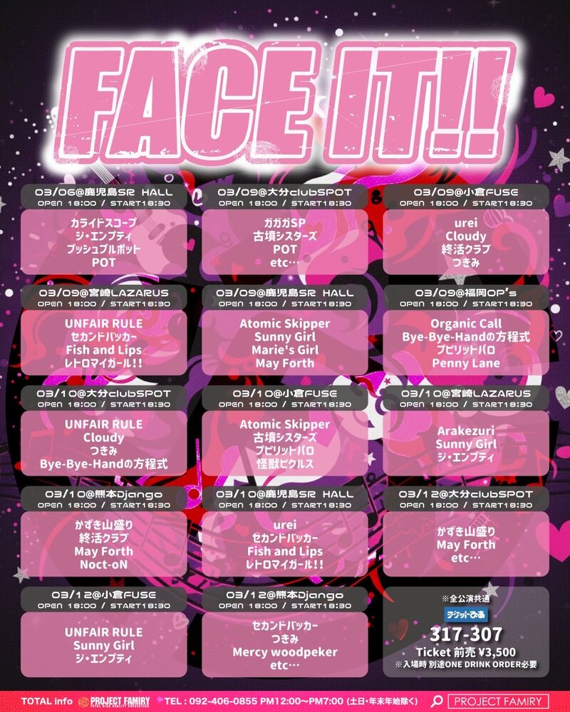 FACE IT!! @福岡 SCHEDULE 2026/03/09(月) 小倉FUSE FACE IT!! 3/9(月) 小倉FUSE 3/10(火) 大分SPOT 3/12(木)熊本Django https://w.pia.jp/t/faceit/ [出演]urei / Cloudy / 終活クラブ / つきみ URLをコピーする 報告する